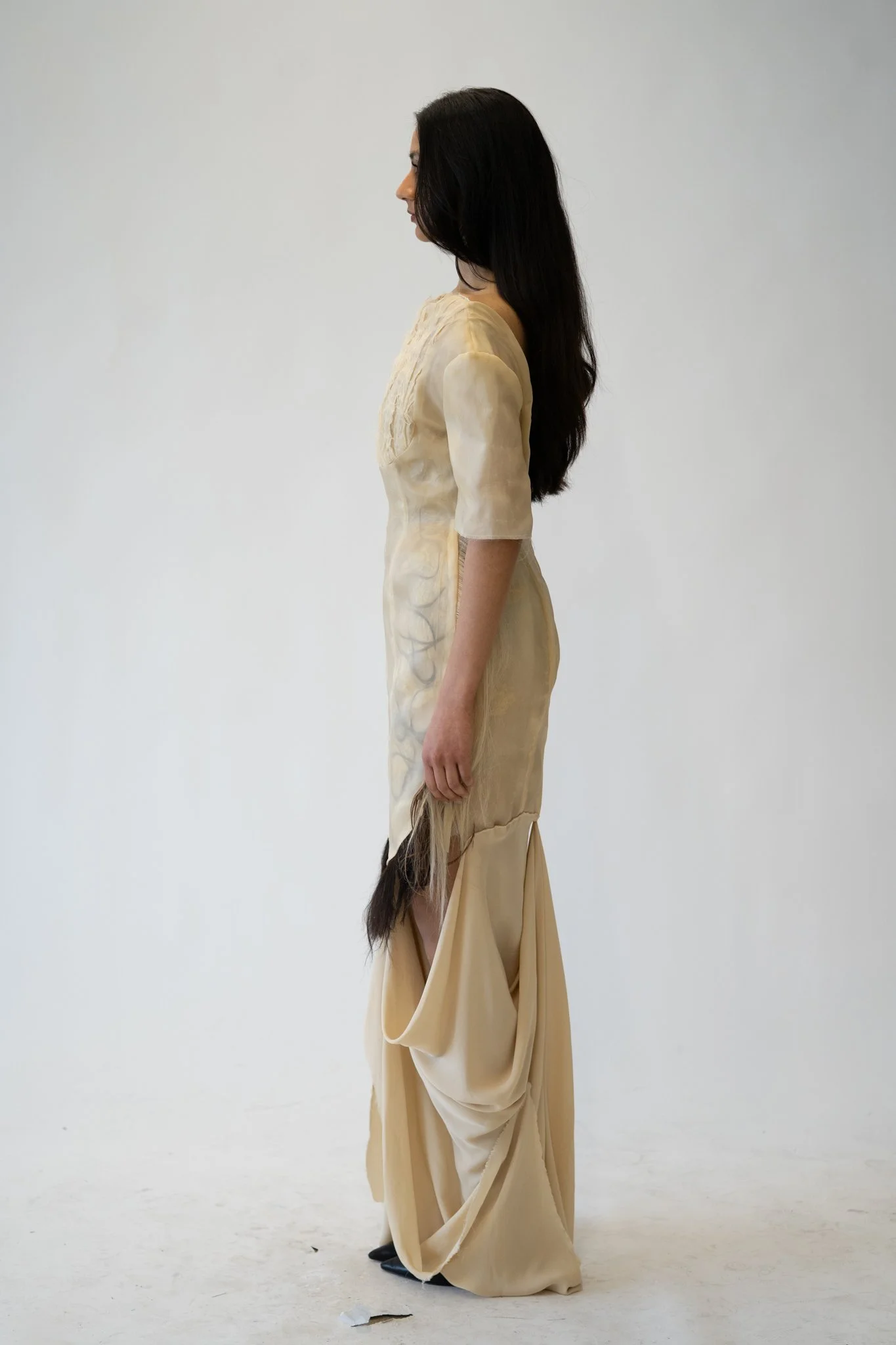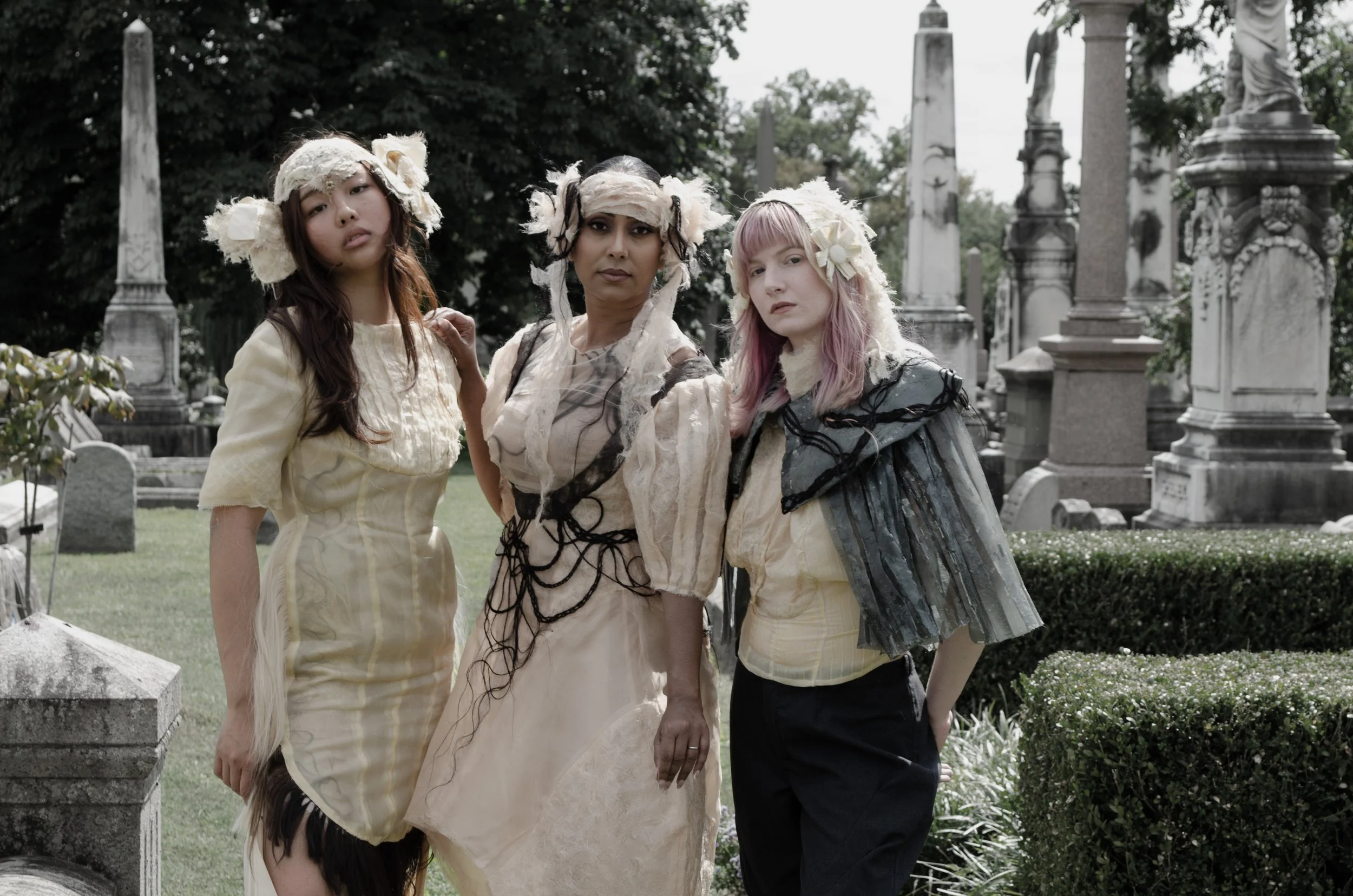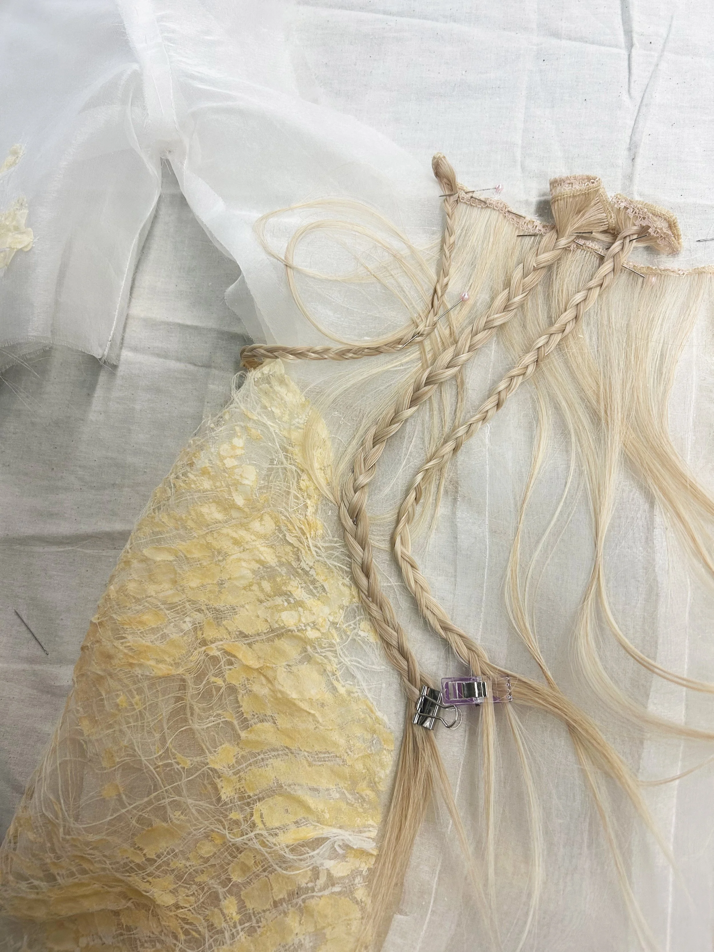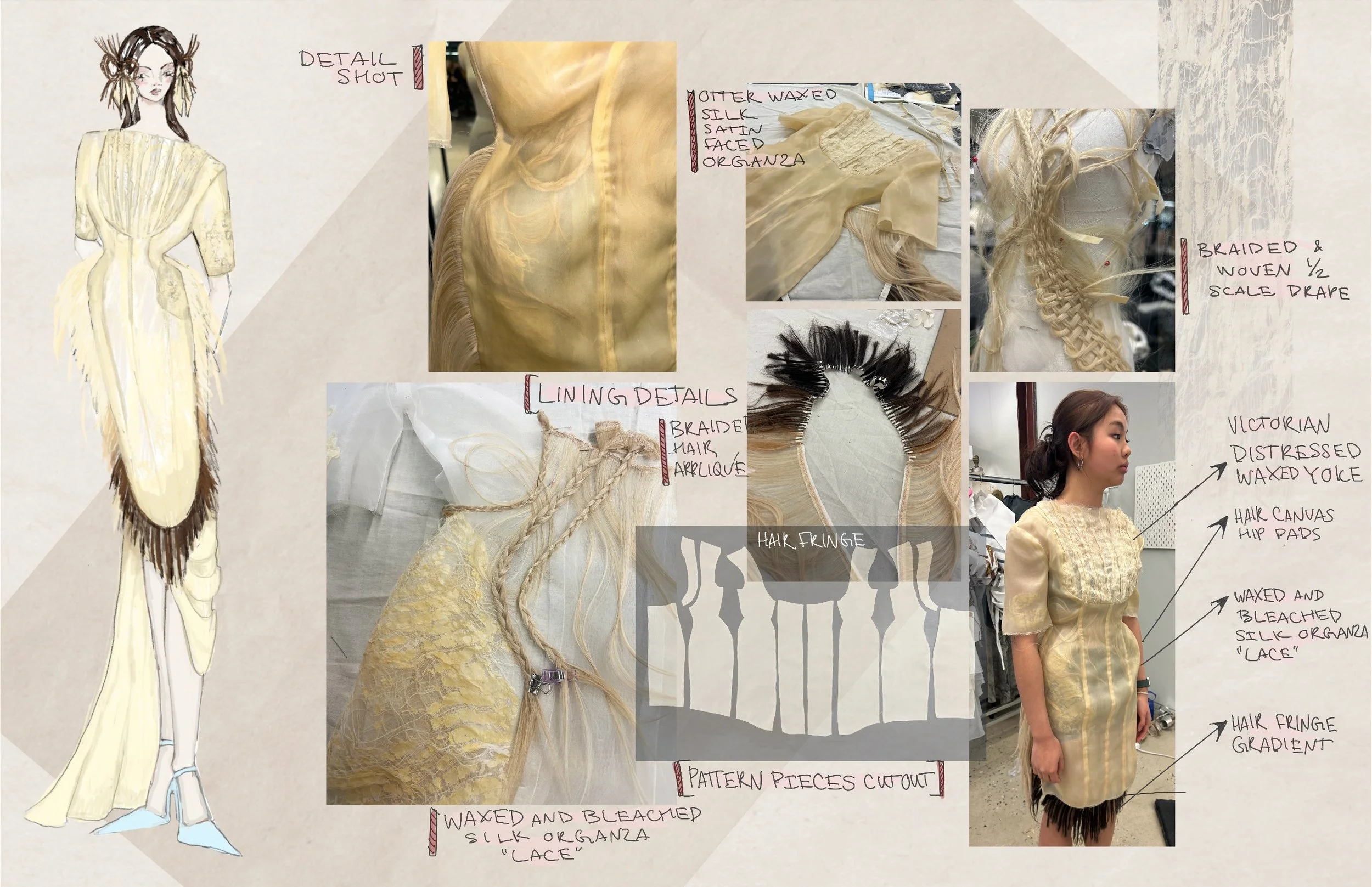 Rooted in a reinterpretation of Victorian silhouettes and the intimate craft of Victorian mourning hair art, The Art of Mourning explores themes of memory, loss, love, and community. Since December, I have been collecting hair from friends and family—a quiet act of care and connection that forms the emotional core of the work. These strands, symbols of both presence and absence, are transformed into elevated appliqué: braided, embroidered across panels, set into seams as fringe, organized into gradients, or encased within the garment between layers of silk organza.