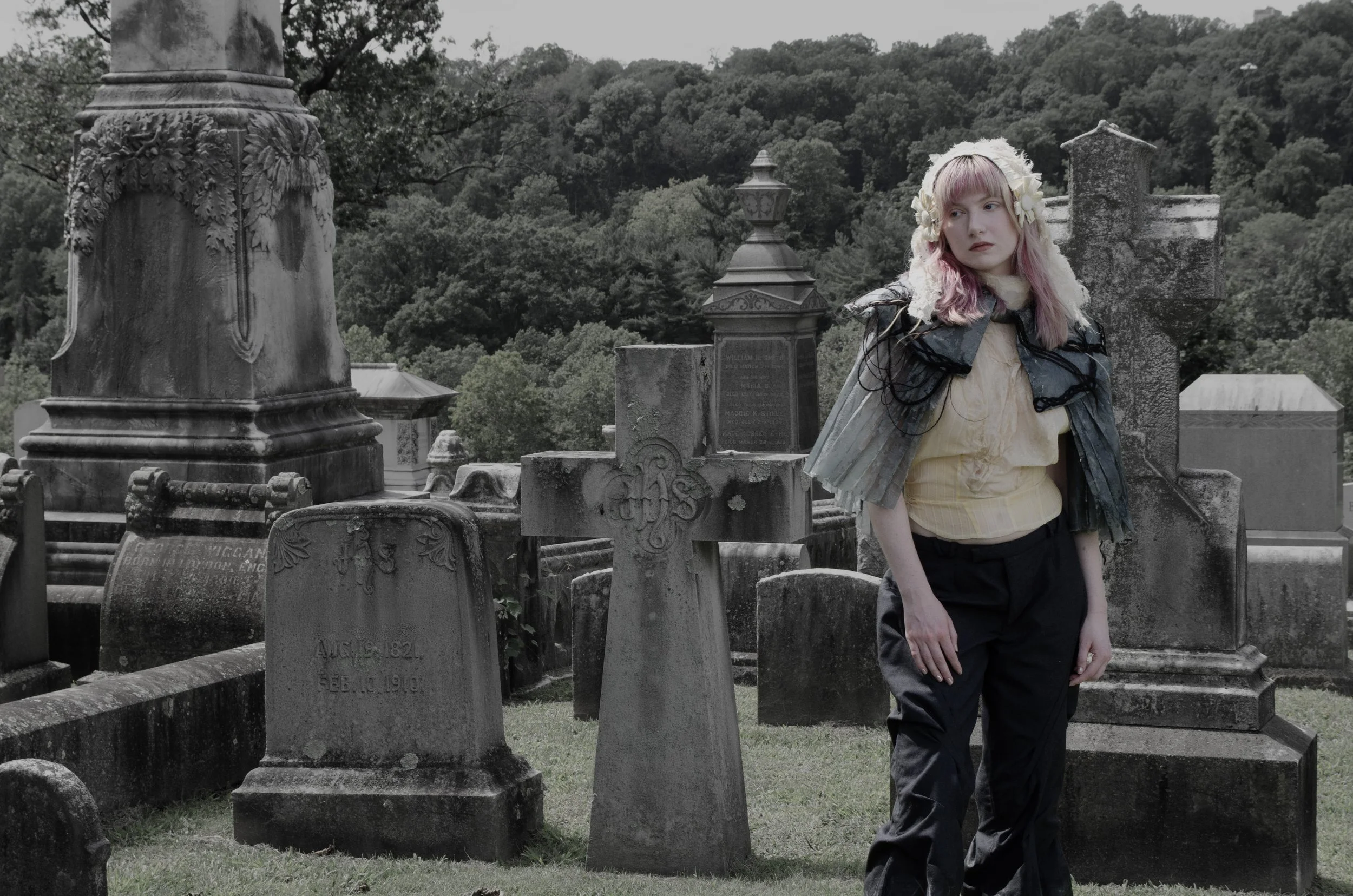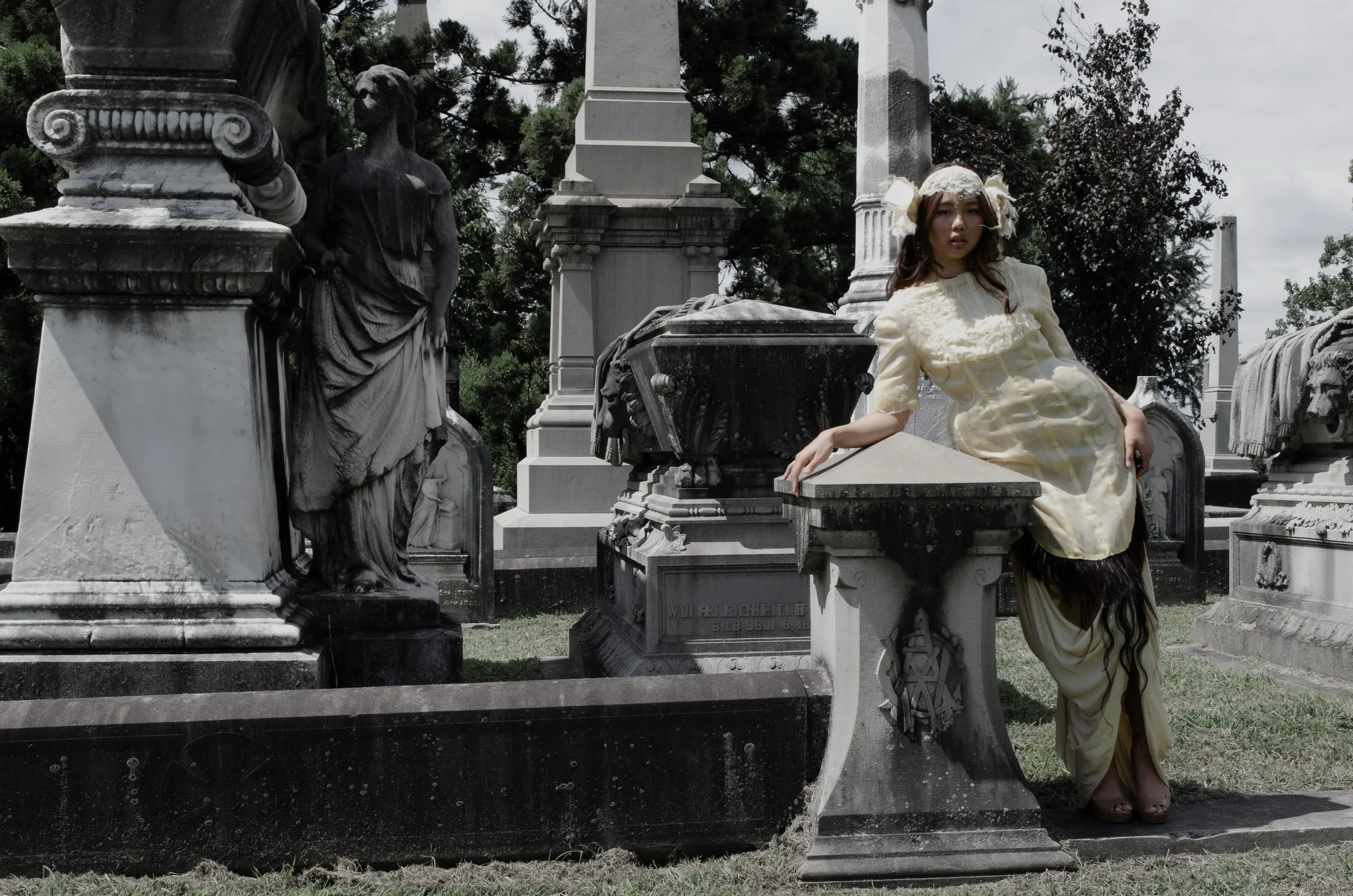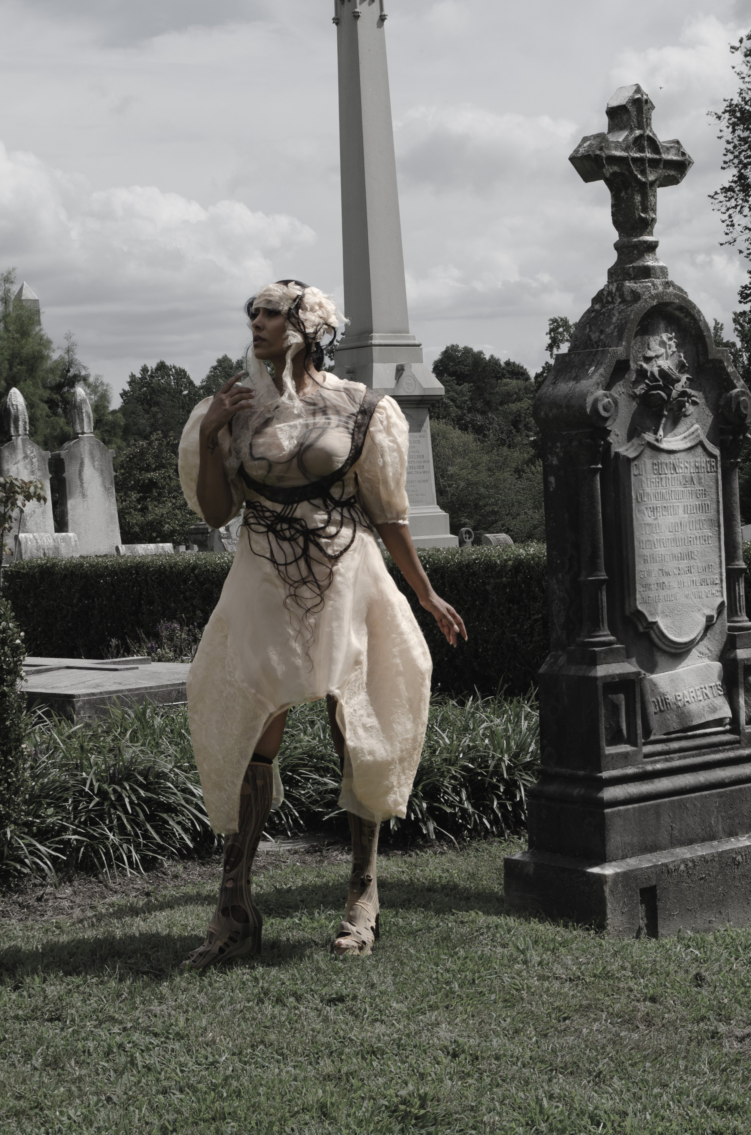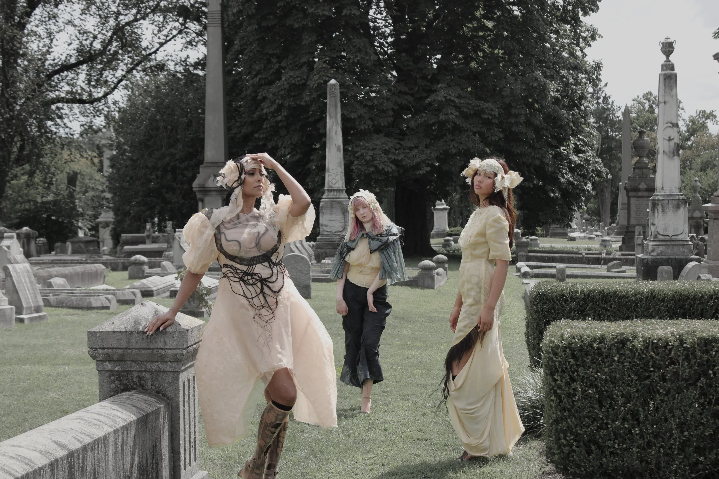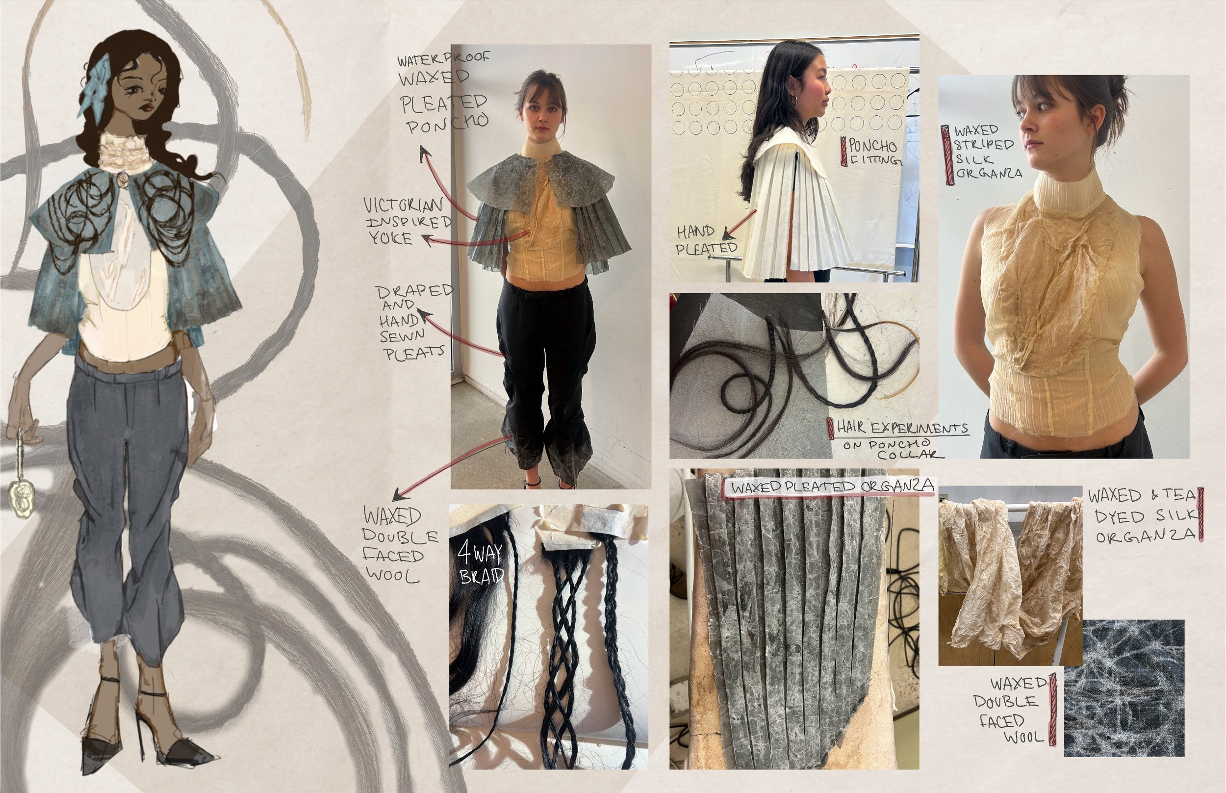 Rooted in a reinterpretation of Victorian silhouettes and the intimate craft of Victorian mourning hair art, The Art of Mourning explores themes of memory, loss, love, and community. Since December, I have been collecting hair from friends and family—a quiet act of care and connection that forms the emotional core of the work. These strands, symbols of both presence and absence, are transformed into elevated appliqué: braided, embroidered across panels, set into seams as fringe, organized into gradients, or encased within the garment between layers of silk organza.